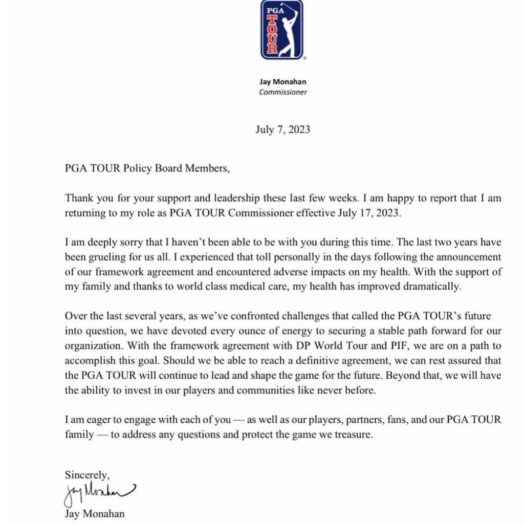 Come sappiamo, all’indomani della pubblicazione dell’accordo quadro tra PIF, PGA Tour e DP World Tour, Monahan aveva annunciato che si sarebbe assentato dalle sue funzioni (temporaneamente affidate a due dirigenti del PGA Tour, Ron Price, Chief Operating Officer, e Tyler Dennis, vice-presidente esecutivo) per poter meglio fare fronte ad una “medical situation” a cui fa riferimento anche nella lettera che annuncia il suo ritorno.