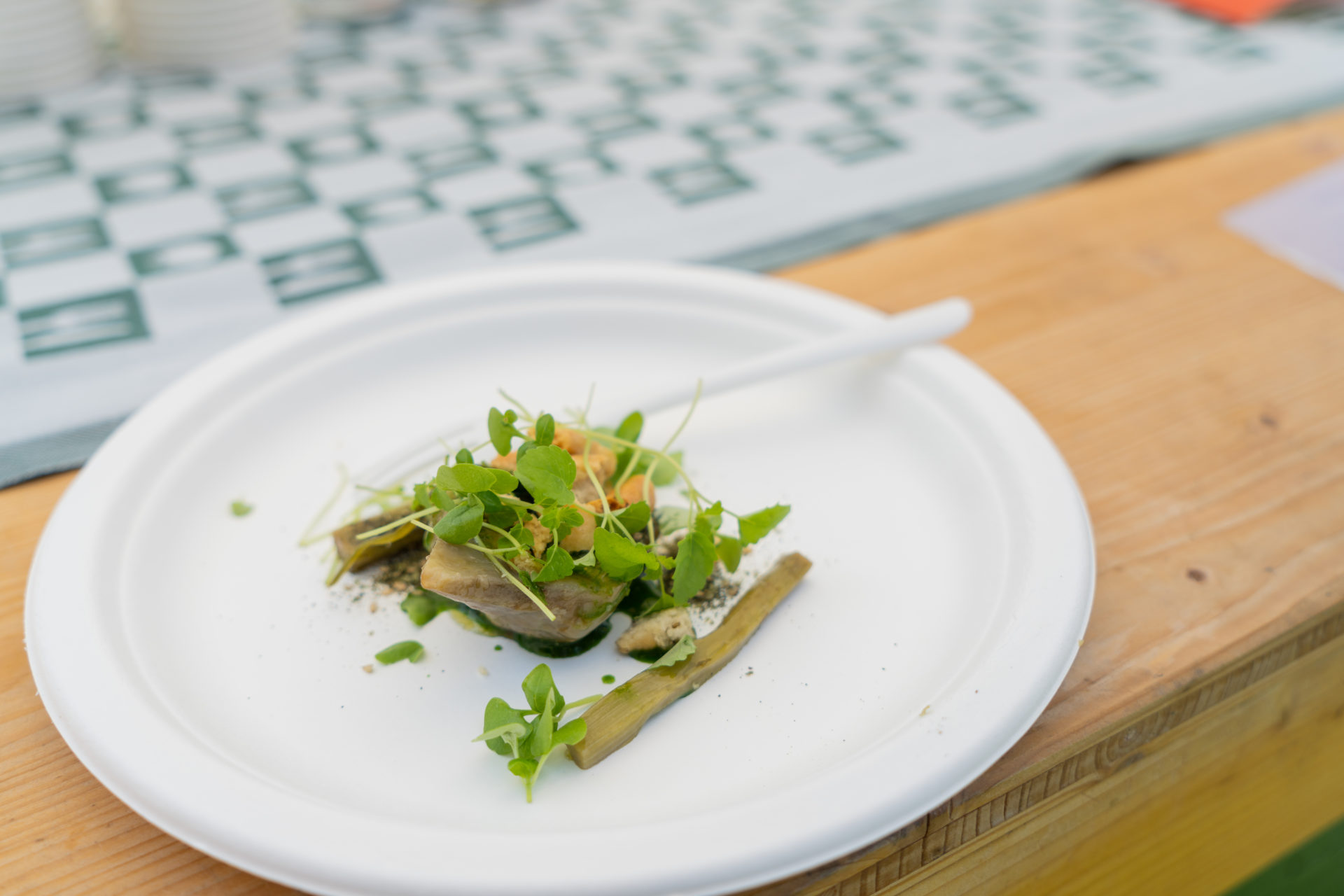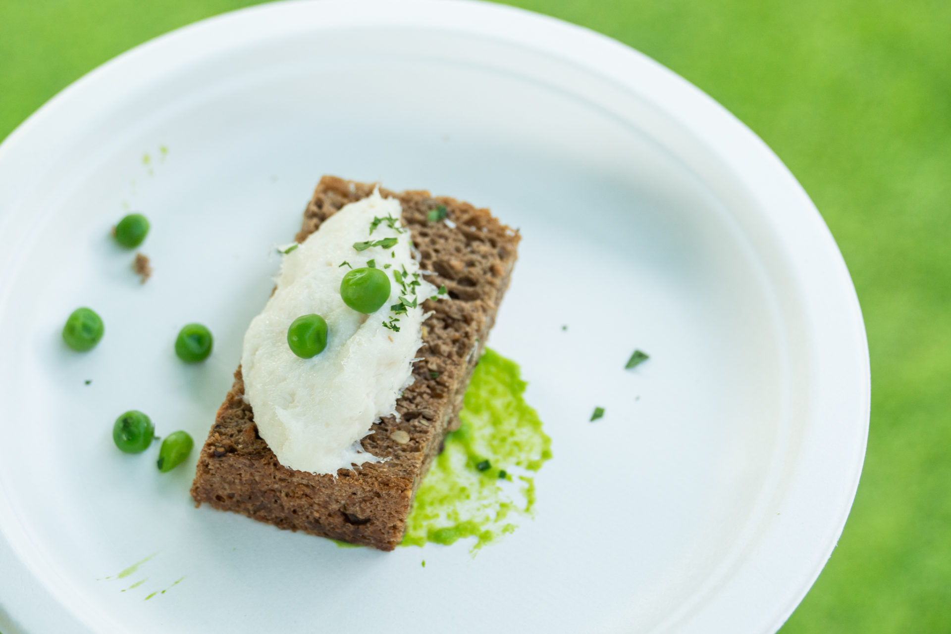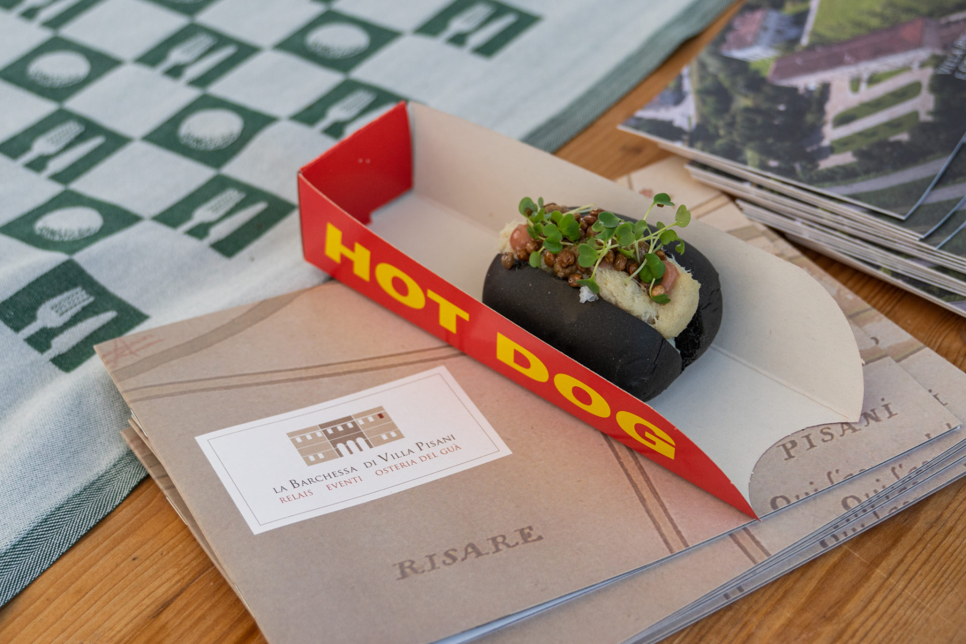 Alla buca 9 sono venuti a trovarci lo chef Marco Culeddu e il maître Luca Pinter – con tutto lo staff del ristorante Osteria del Guà (Bagnolo di Lonigo, VI) – presentando un singolare hot dog ai carboni, farcito con baccalà mantecato, gel di rabarbaro e lenticchie Martino Rossi soffiate, olive e salsa olandese.