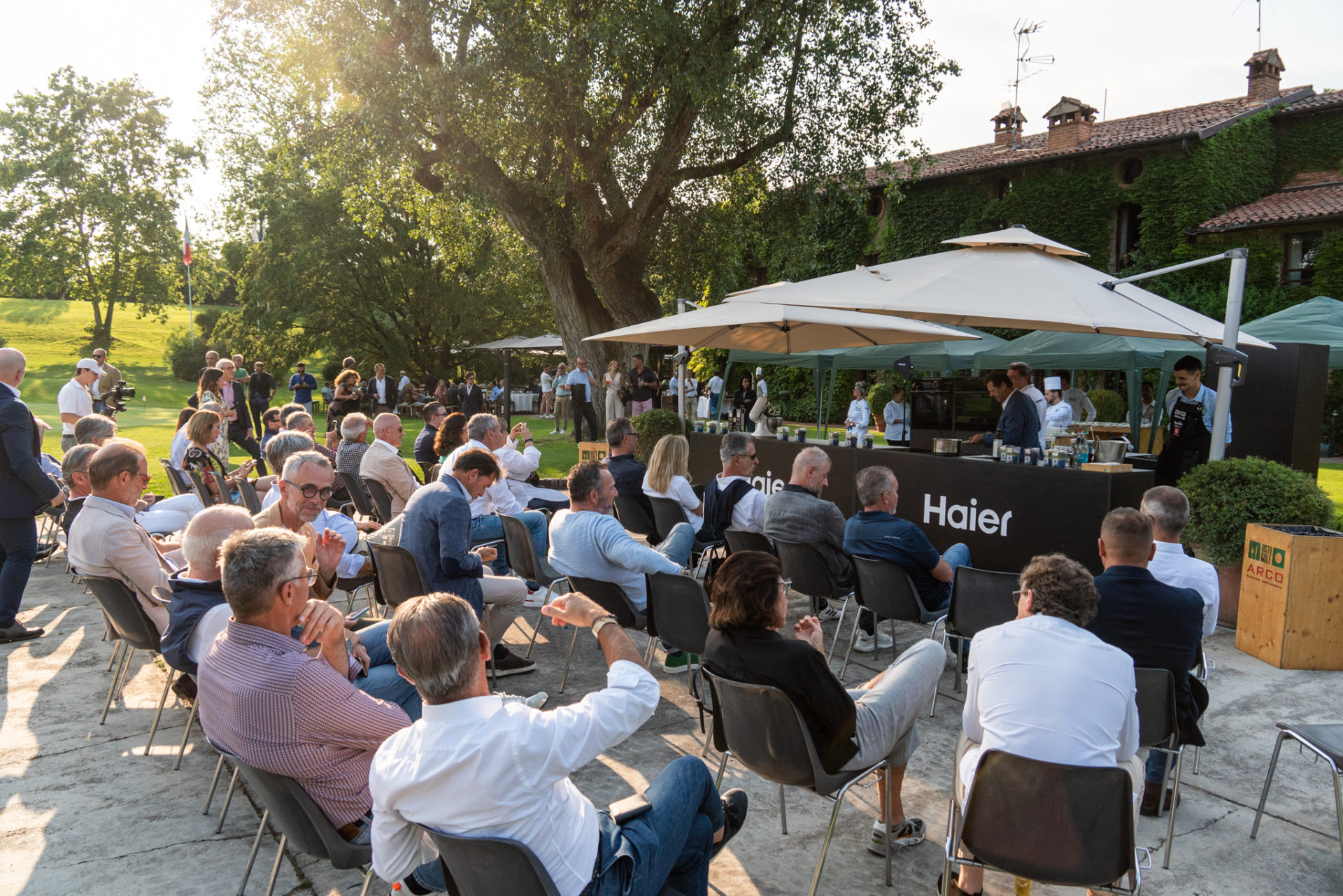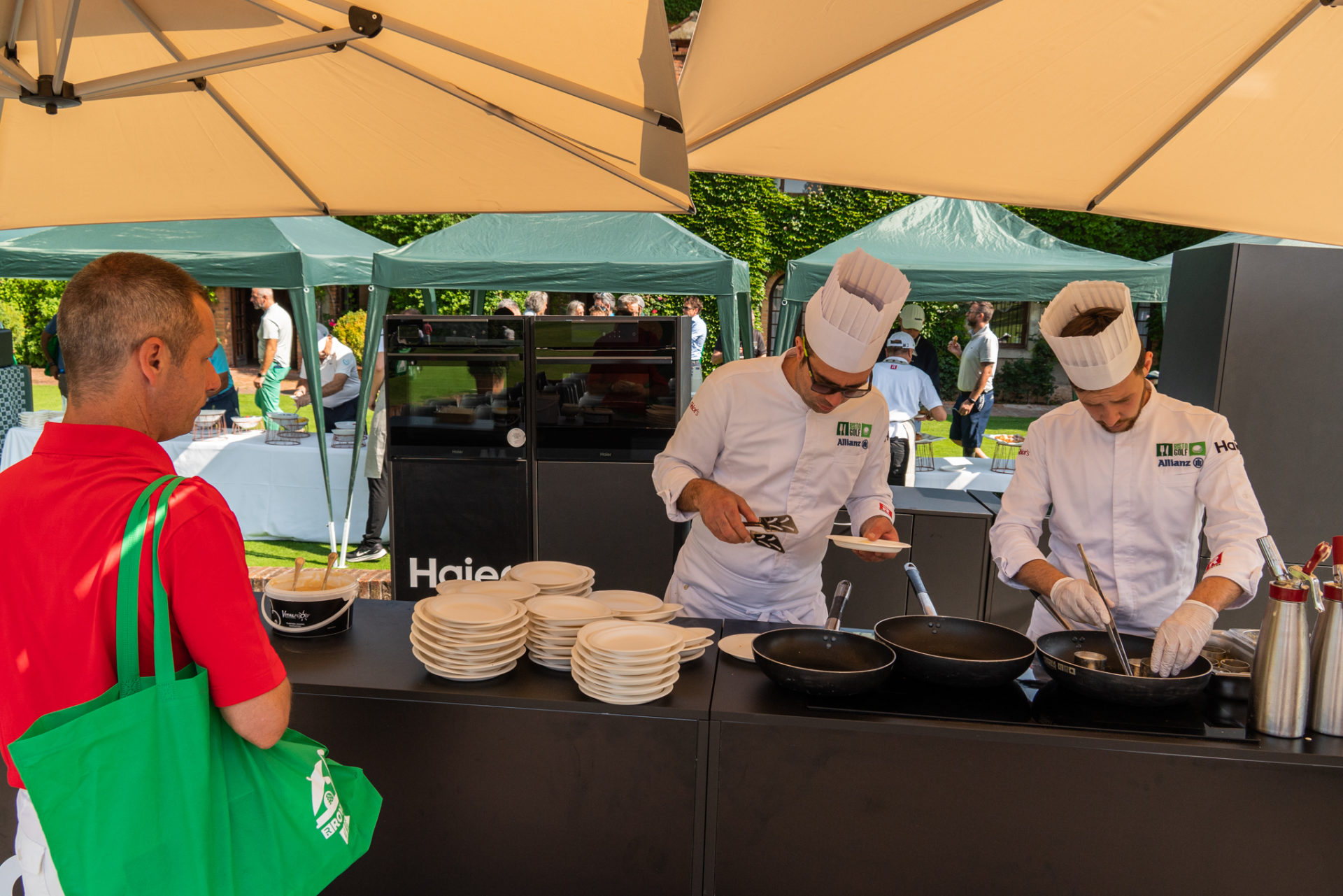 Dopo la gara, un momento di relax per i nostri giocatori. Seduti comodi, inizia lo spettacolo. Inizia lo showcooking con le attrezzature del Main Sponsor del Circuito Ristogolf 2023 by Allianz: un grazie ad Haier!