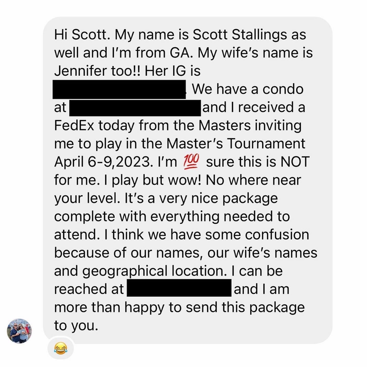 Quindi l’agognato invito era stato correttamente spedito, ma ad un omonimo di Stallings, la cui moglie ha lo stesso nome della moglie di Scott (!), che vive in Georgia, mentre lo Stallings “giusto” risiede a Knoxville, nel Tennessee.