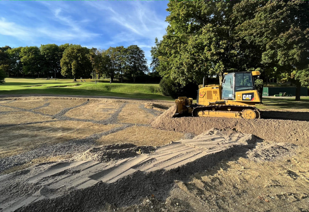Successivamente viene posizionato uno strato di ghiaietto di 10cm che ricopre l’intero green. Sopra questo viene posizionato uno strato di sabbia grossa di 5cm, e infine uno strato di sabbia di 30cm. L’apparato radicale del green si svilupperà in quest’ultimo strato.