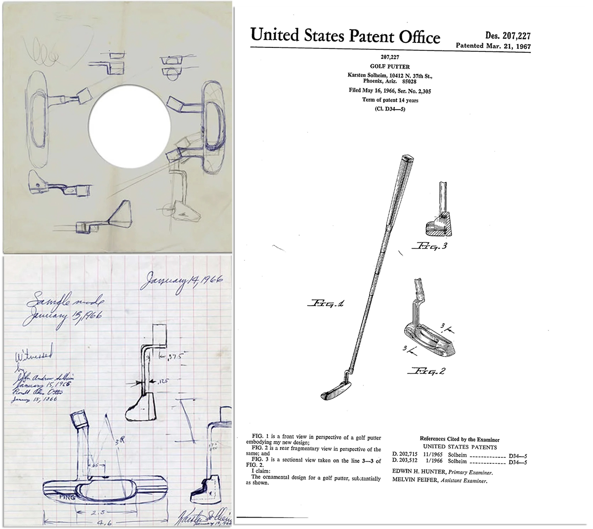 Nel gennaio del 1966 Karsten era presente al Los Angeles Open, il torneo di apertura della stagione, dove tutti gli stand presentavano putter di tipo blade, nello stile del leggendario Wilson 8802 usato da Arnold Palmer. Appena rientrato a casa, Solheim si mise subito al lavoro su un’idea innovativa come risposta – “answer” – al modello di putter più in voga fino a quel momento; buttò giù uno schizzo sul retro della copertina di un disco 78 giri, la mattina dopo rifinì i disegni su carta millimetrata e quattro giorni dopo il primo prototipo del nuovo putter era pronto. Il peso della testa era stato spostato sulla punta e sul tacco per una maggiore stabilità, la faccia presentava una cavità posteriore per abbassare il centro di gravità e migliorare il rotolamento della palla e l’attacco dello shaft era stato ridefinito con un certo offset in modo che non interferisse con la linea visiva quando il giocatore si allineava sulla palla. Il nome venne da un’idea di sua moglie Louise: dal momento che la parola era troppo lunga per inciderla sul retro della punta, lei suggerì di eliminare la “W”, cosa che non ne avrebbe alterato la pronuncia. Era nato il Ping Anser.