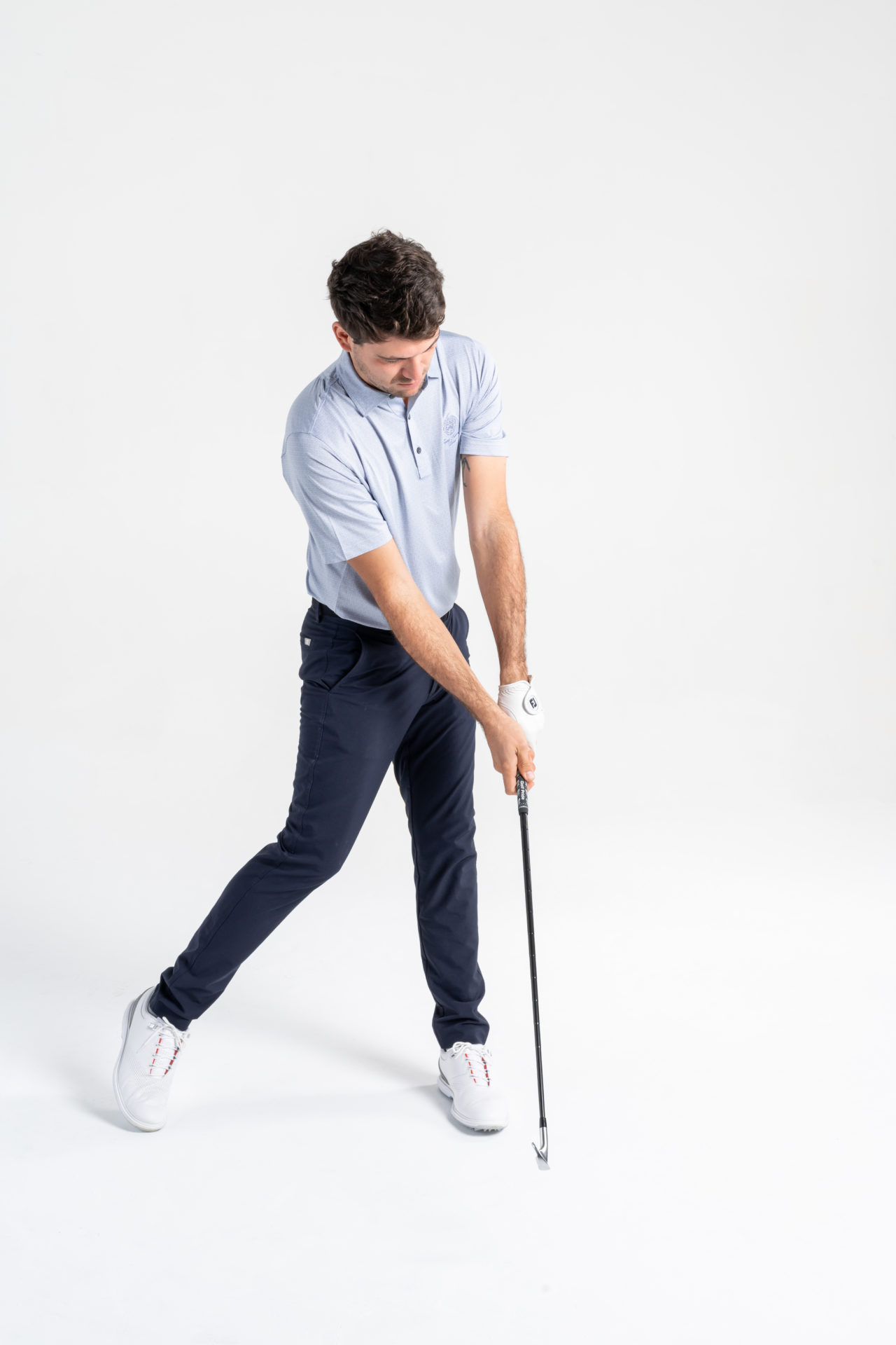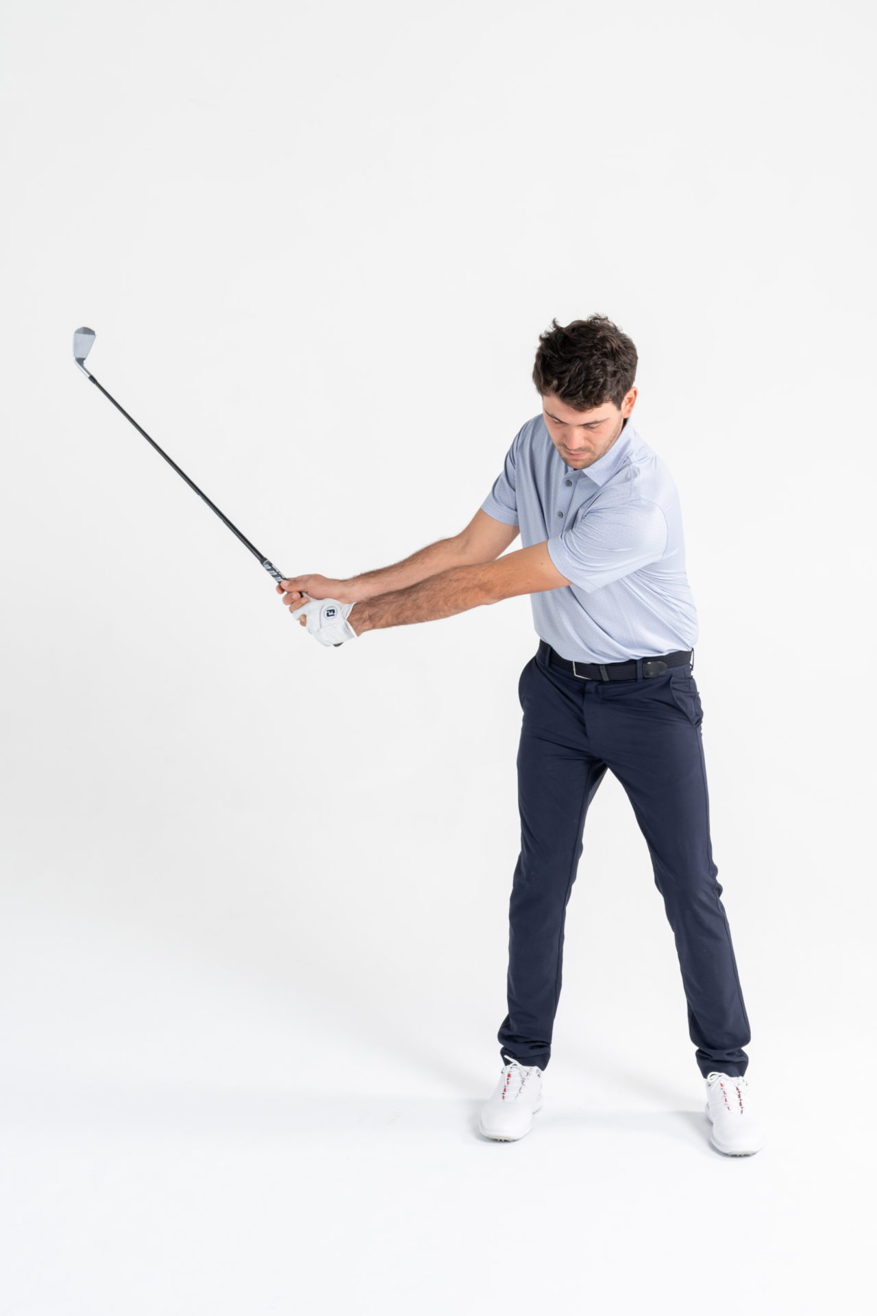 La grande particolarità è che quindi si inizia a spostare il peso e a ruotare quando il backswing deve ancora finire. Il bastone ha molto slancio durante la salita e,anche se il corpo sta già “contro-ruotando”, il backswing risulterà completo.