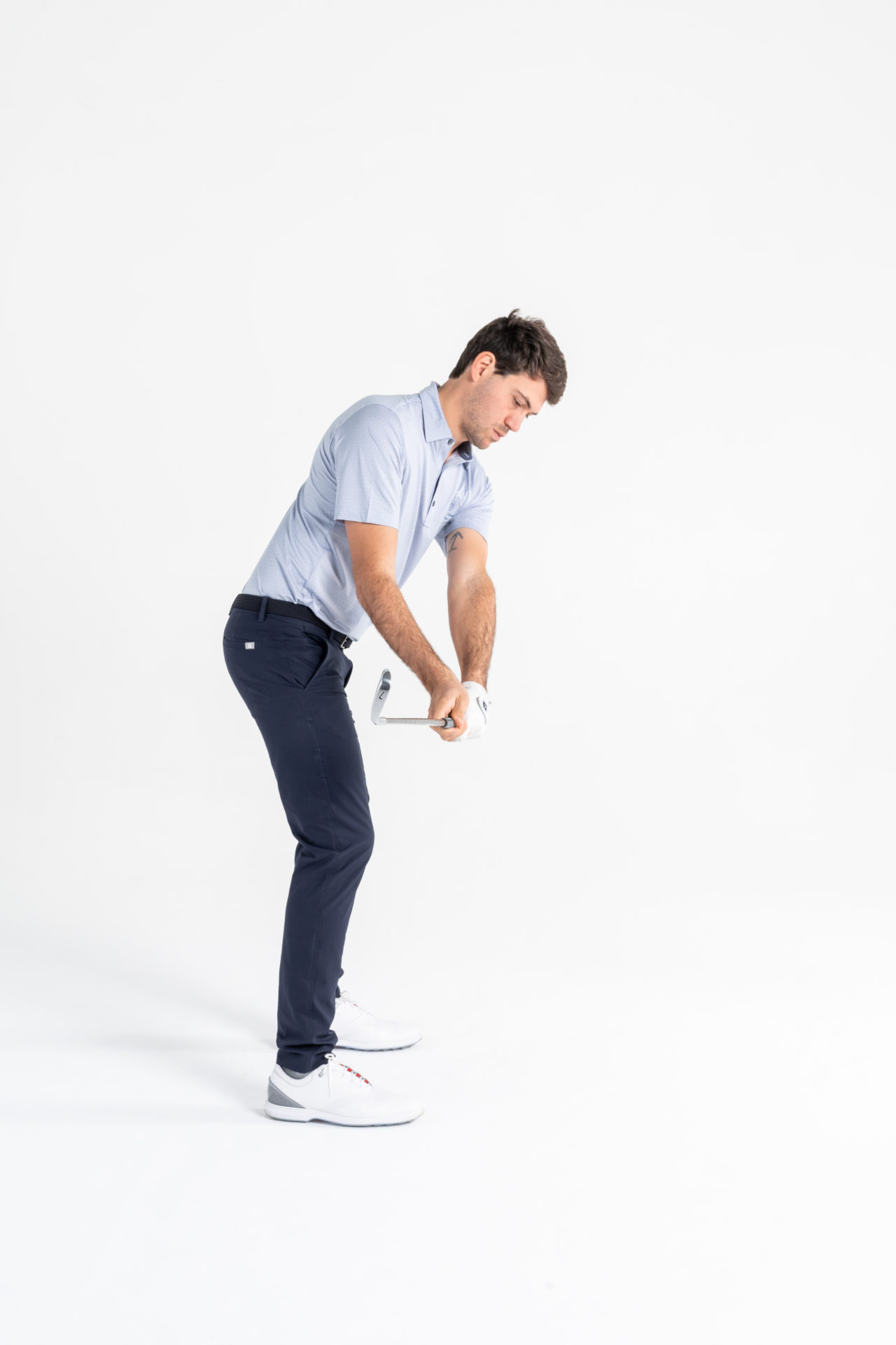 Il polso destro è un riferimento importantissimo all’interno del movimento. Esso aiuta a regolare la posizione della faccia del bastone e consente di posizionare lo shaft correttamente durante lo swing. Come si puo’ notare dalla foto in basso, il polso destro e l’avambraccio destro creano un angolo. E’ uno dei pochissimi elementi che hanno in comune tutti i giocatori professionisti.