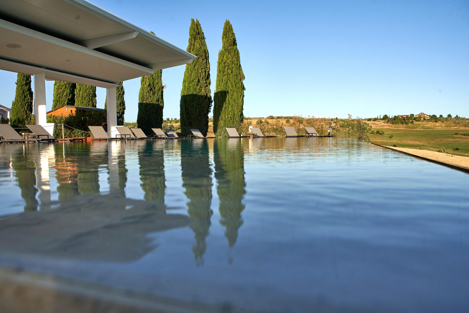 Servizi: Bar/Ristorante, Piscina a sfioro, Spogliatoi, noleggio carrelli, noleggio cart, caddy master, campo pratica, pitching green, putting green.